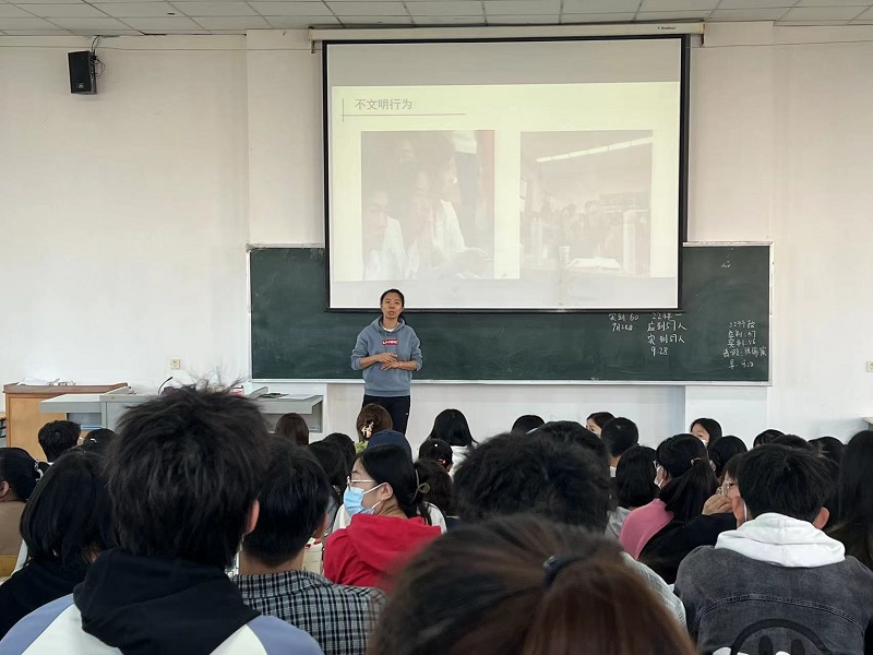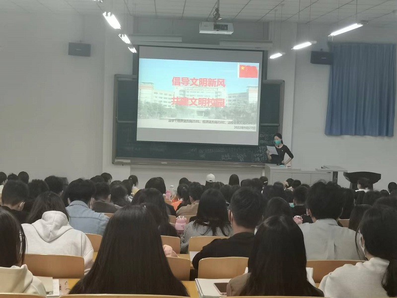 9月27-28日在1号教学楼415、实验楼110等教室,法学院分别举办了大小班共11场校园文明专题教育班会,涵盖法学院全体学生。领导班子和辅导员老师根据备课内容,从文明守则的四个方面认真进行讲解,最后全体学生签署了文明守则承诺。班会结束之后,各年级学生争相报名文明督查队员,都表现出了参与校园文明督查工作的强烈愿望,充分展现了法学学子乐于奉献、敢于担当的精神。