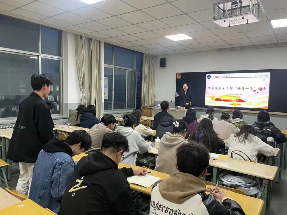 为精准贯彻落实学校“三抓三促”教育,引导学生干部今后的工作方向,提高学生干部综合素质。3月22日19点30分,法学院于博学楼510教室召开春季学生干部会议暨学生干部“每月一学”例会。本次会议由我院团总支书记马子珺主讲,主席团成员和各部门负责人参会。