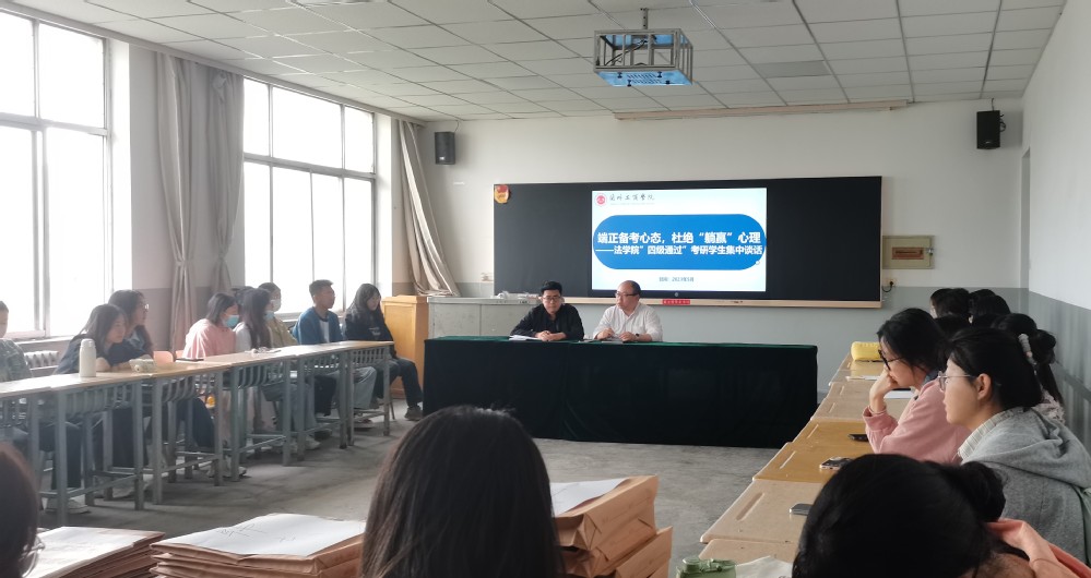 2023年5月25日,法学院在1-509教室开展2020级考研备考学生集中谈话。法学院党委书记刘涛、2020级辅导员蔡小斌和法学院2020级图书馆8楼全体考研备考学生参加谈话。