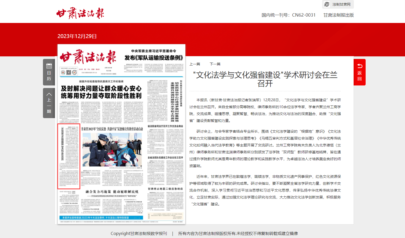 12月28日下午,“文化法学与文化强省建设”学术研讨会在兰州工商学院召开。来自全省部分高等院校、律师事务所的10余位法学专家、学者齐聚兰州工商学院,围绕“文化法学与文化强省建设”主题,交流成果、碰撞思想、凝聚智慧、畅谈法治,为推动文化与法治的深度融合、助推“文化强省”建设贡献智慧和力量。
