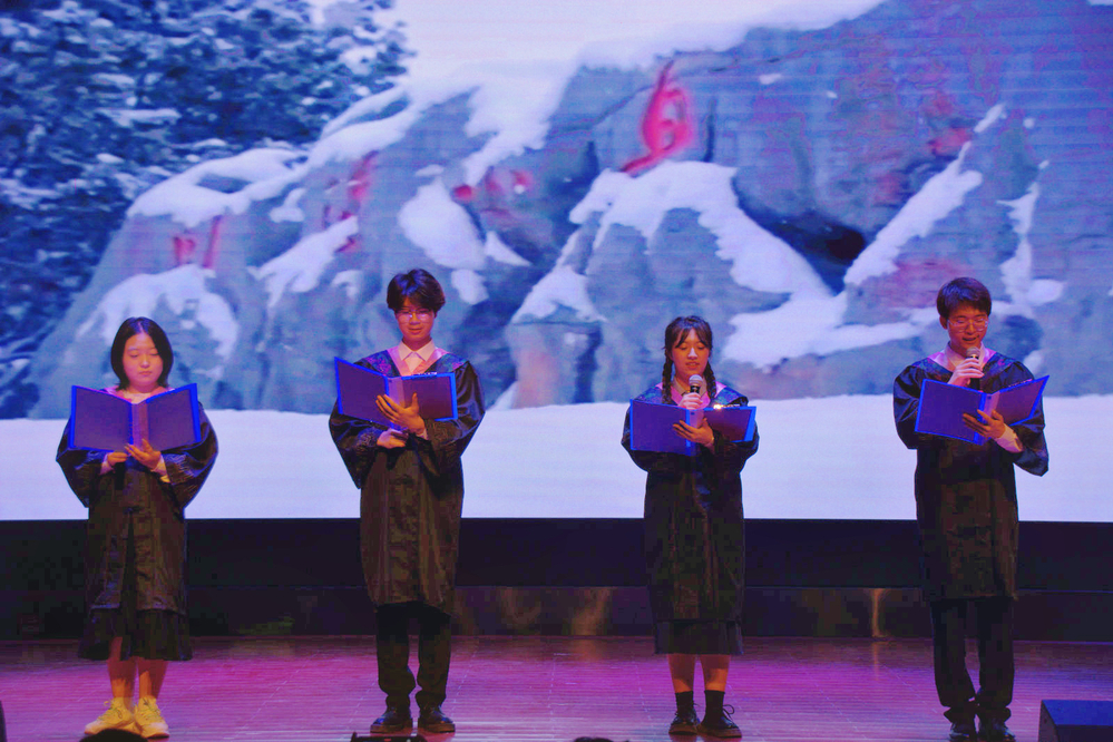 晚会中,同学们通过深情朗诵和短视频等多种形式,回顾了大学生活中点点滴滴和精彩片段,勾起了毕业生对青春岁月的无限怀念,激励着他们在未来的道路上勇往直前、追逐梦想。