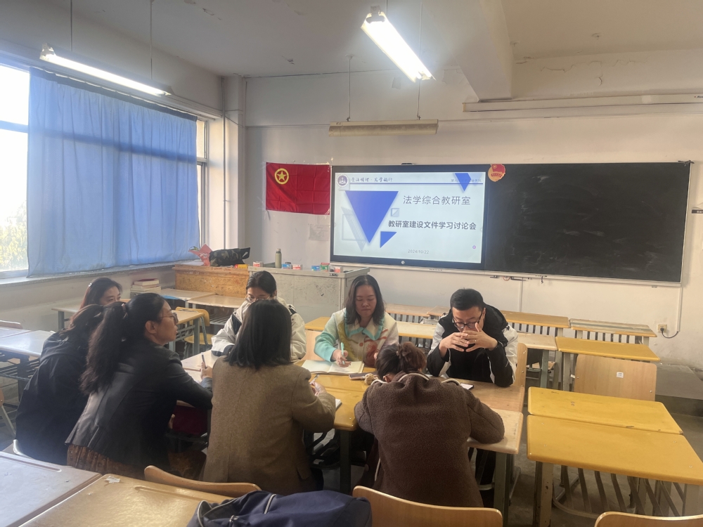 为进一步加强教研室建设,帮助新进教师快速融入教研室,促进教研室成员教学科研水平的提高,2024年10月22日下午,法学综合教研室在慎思楼407教室开展加强教研室建设文件学习活动。活动由教研室主任李毅老师主持,教研室全体成员参加。