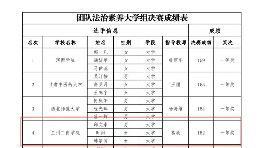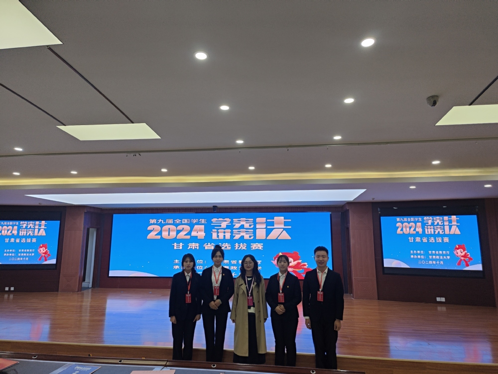2024年10月25日,喜讯传来!在第九届全国学生“学宪法 讲宪法”活动甘肃省选拔赛的团队法治素养竞赛中,我校学子凭借扎实的宪法知识、出色的团队协作和卓越的临场发挥,荣获大学组一等奖。