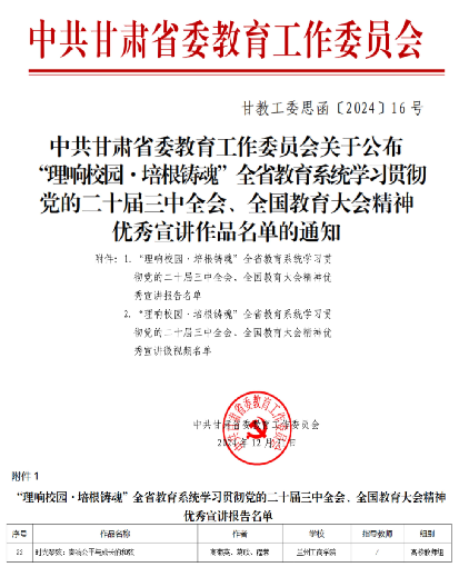 在省委教育工委举办的“理响校园・培根铸魂”全省教育系统学习贯彻党的二十届三中全会、全国教育大会精神宣讲作品征集活动中,我院教师高菊英、葛欣、程蓉共同撰写的理论宣讲报告《时光琴弦:奏响公平与成长的和弦》脱颖而出,被评为优秀宣讲作品。