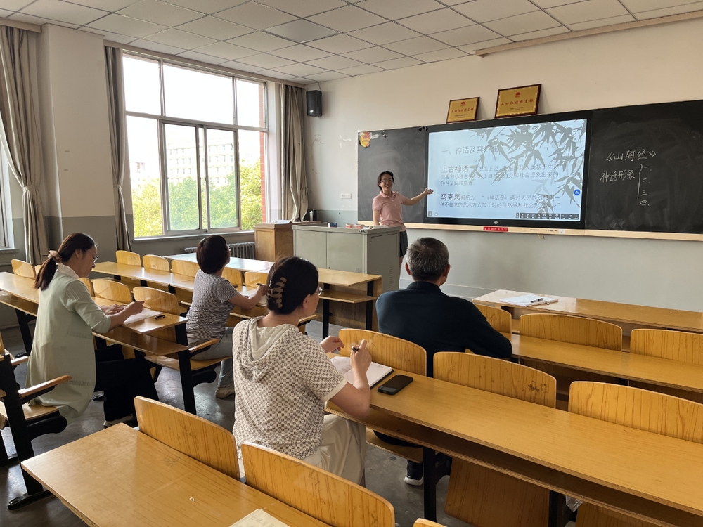 随后,新进教师张馨月带来中国古代文学课的试讲内容—— 古代神话。以“神话为何是民族文化的源头”为核心问题,通过“文本对比”“意象解读”等教学方法,将抽象的文化内涵转化为具体可感的课堂内容。试讲过程中,她从容的教态、清晰的逻辑与对传统文化的深厚理解,赢得了教研室老师们的认可。
