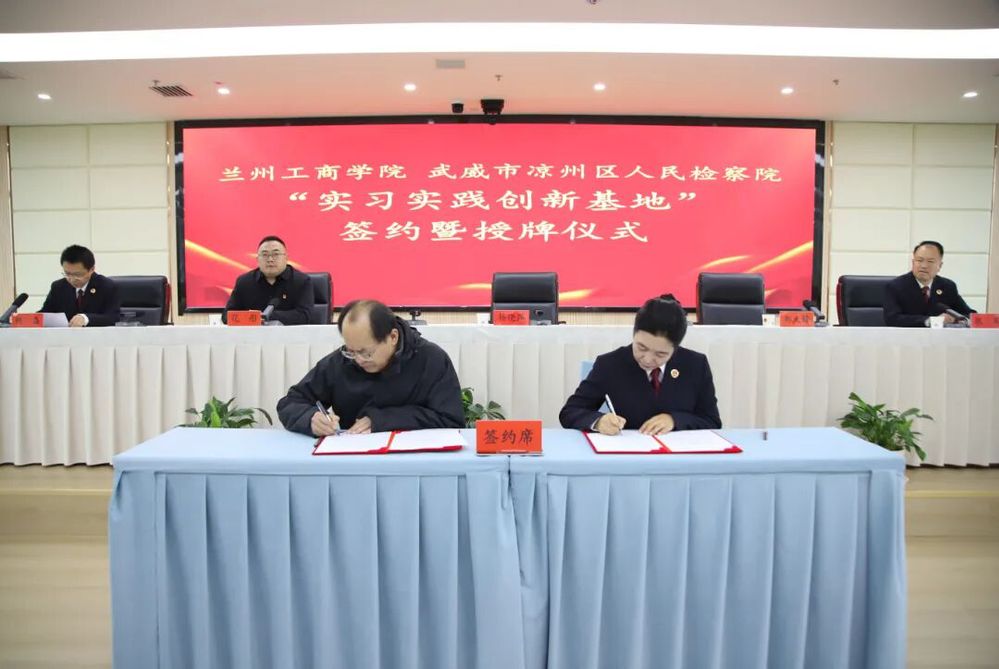11月7日上午,兰州工商学院与凉州区人民检察院共同举行“实习实践创新基地”签约揭牌仪式。兰州工商学院文法学院教学院长郑天锋,凉州区人民检察院党组书记、检察长杨晓萍共同签署了《兰州工商学院学生实习基地框架合作协议》,并为“兰州工商学院实习实践创新基地”揭牌。