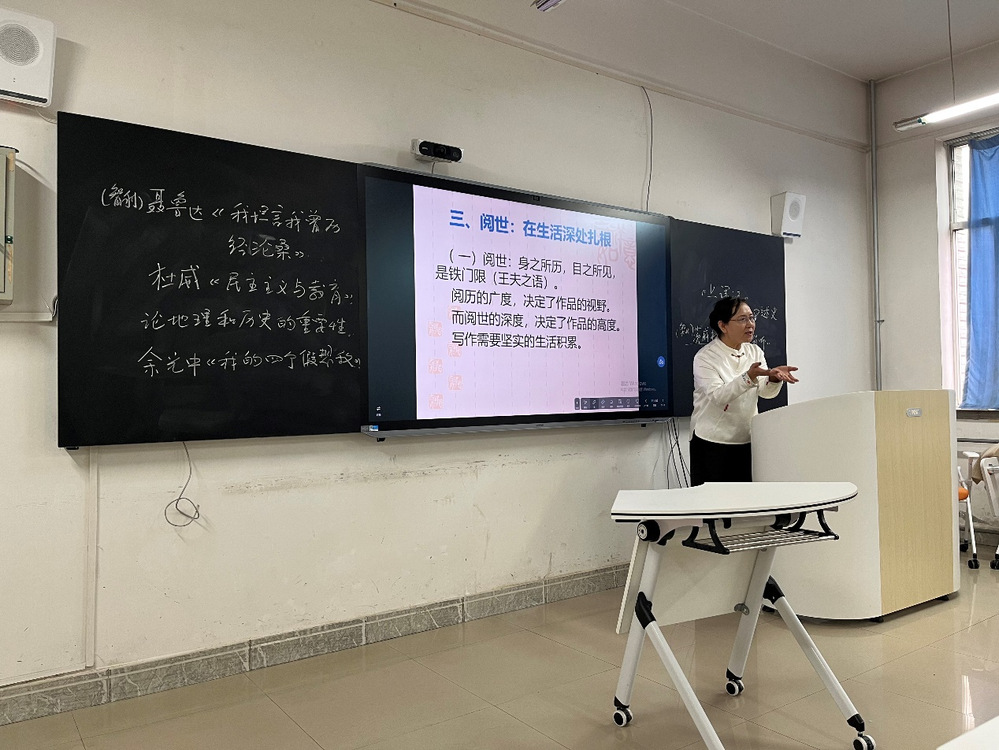 彭青教授首先从法国哲学家萨特的写作观切入,指出写作不仅是“揭示”与“创造”,更是一种对世界的“介入”。她援引陆机、曹丕、司马迁等中国古代文人的观点,进一步阐释了写作作为“不朽之盛事”的精神价值。在谈到“阅读”时,彭教授将其比喻为“打开万千世界的窗”:阅读不仅是写作的基石,更是思想与情感的源泉,写作与阅读之间是一种“动态循环、共生共长”的关系,二者缺一不可。最后,彭教授总结,阅读、阅世与写作三者融合,不仅塑造一个人的表达能力,更成就其“存在的深度”。她鼓励学生在广泛阅读中汲取智慧,在真诚写作中照见自我,在深入生活中扎根成长,最终实现精神世界的丰盈与人格的完整。