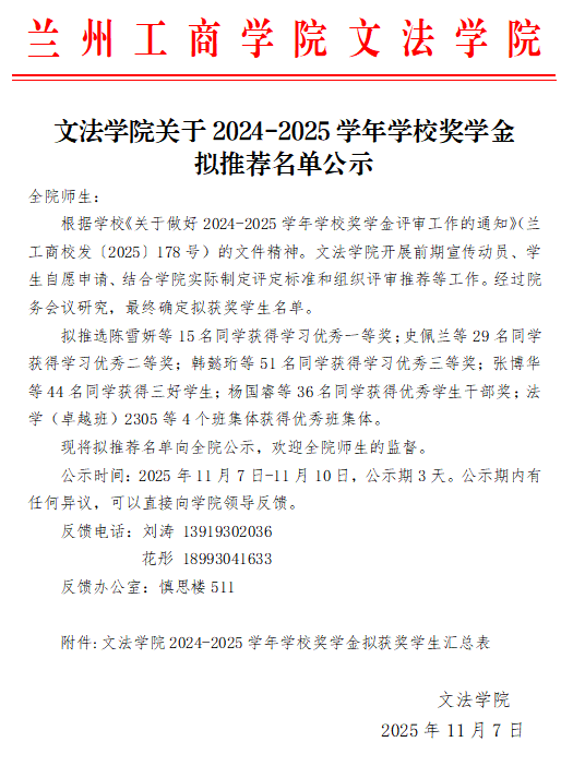 文法学院关于2024-2025学年学校奖学金拟推荐名单公示