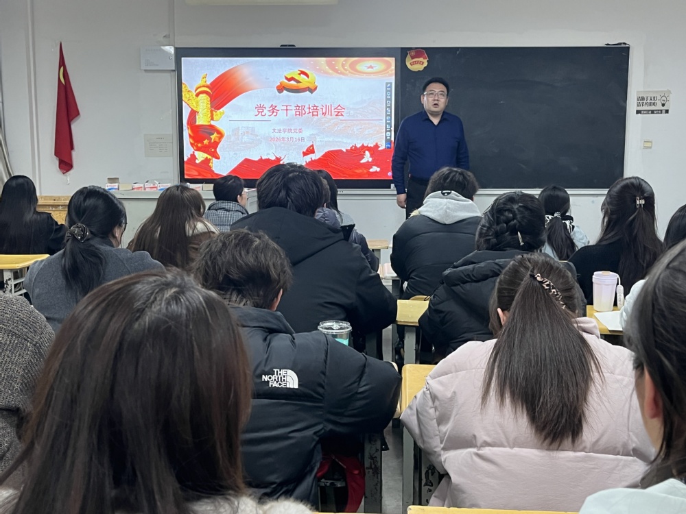 为进一步加强学院党务干部队伍建设,明确新学期工作方向,提升党务工作质效,2026年3月16日文法学院党委在慎思楼504教室召开本学期党务干部...