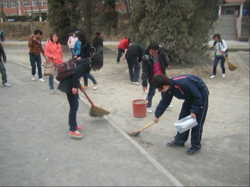 下午16:15,同学们拿着笤帚、火钳、簸箕都整装待发集合于图书馆前。首先由系党总支书记丁敏做了活动前的动员讲话,随后,学生队伍按照预定计划分成五组,分别进入各自的负责地点进行清扫。从学院前门到操场再到宿舍区各小组分工明确,在团总支书记彭勇和学生干部的带领下,大家对校园内草坪、绿化带、马路两边等区域进行了一次彻底的清扫。同学们都积极参与,认真仔细的清理墙头小广告、打扫广场、捡纸片。经过一个小时的努力,我们的校园变得更加的干净整洁,无处不洋溢着青春的朝气。