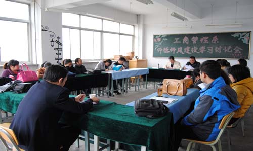 系党总支副书记张勇首先宣读了由中共中央组织部、中共中央宣传部和教育部党组今年下发的《关于加强和改进高校青年教师思想政治工作的若干意见》和《高等学校教师职业道德规范》,希望大家统一思想,提高认识,认真对照检查,弥补不足,积极提高思想认识水平和业务知识水平;希望教工党员充分发挥党员模范带头作用,将此次教育活动作为个人学习党的群众路线教育实践活动的主要载体,立足岗位创先争优;李金峰主任在讲话中,要求全体教职工一定要牢记使命,教书育人,认真做好本职工作,适应我院内涵发展建设需要,唱响主旋律,在全系教职工中积极营造良好的教风,全面推进我系教学科研和教育管理工作的良好风气。随后,各位教职工围绕师德师风教育主题的相关内容展开了热烈的讨论。