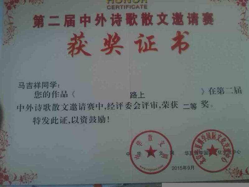 会上,我系学生马吉祥取得了优异的成绩,原创诗歌《路上》荣获大赛二等奖。据悉,此次中外诗歌散文邀请赛是由中华散文网、华夏博学国际文化交流中心主办,世界诗人大会中国办事处协办。共有中外18000多人的作品参加比赛,从中评出最佳诗歌散文和一、二、三等奖共120多篇。
