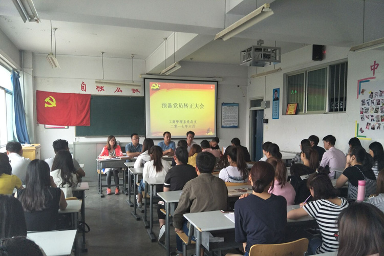 根据学院党委关于党员发展的安排和要求,结合我系各学生支部实际情况,6月2日下午,工商管理系各学生党支部召开了本学期预备党员转正大会,讨论了康明君等30名预备党员的转正问题。工商管理系党总支书记康昱明、各学生党支部书记、全体学生党员参加了大会。会议由党政秘书、第一党支部书记刘霞主持。 会前,组织委员清点了与会正式党员人数,并由党支部负责人介绍了会议流程。 会上,各预备党员对自己预备期间的思想认识和现实表现向支部大会进行汇报并提出转正申请,入党介绍人阐述了预备党员在预备期间的表现并表明了自己的立场与态度,与会党员积极发表自己对各预备党员的看法,从生活、学习到工作能力给出了中肯客观的评价。与会正式党员对康明君等30名同志逐一进行了举手表决,一致同意康明君等30名同志按期转正。 会议表决后,各支部书记进行了总结讲话,要求全体党员牢记党的性质和宗旨,牢记入党誓词,不仅要从组织上入党,还要从思想上入党,从行动上入党,切实以一名党员的身份严格要求自己,充分发挥学生党员的先锋模范作用,为班级、为学院的各项工作做出更大的贡献。