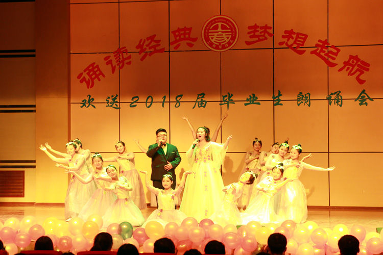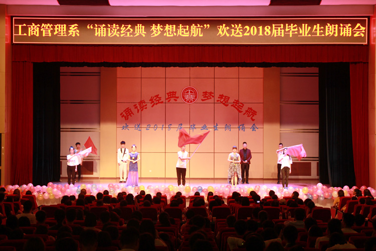 2016级物流管理班带来的朗诵《少年中国说》拉开了整场朗诵的序幕,体现了当代大学生胸怀远大理想,励志报效祖国的坚定信念。2016级工商管理班的朗诵《寻梦者》,优美的伴舞与饱含深情的朗诵,表达了大学生应该成为这个时代最忠诚的拥护者。2016级旅游管理班将《不忘初心---红船梦》演绎的绘声绘色,激励一代又一代中华儿女不忘初心,砥砺前行。2016级市场营销班的同学一曲《蜀道难》更是千古绝唱,毕业后的路程还长,愿毕业生们能够愈挫愈勇,再上高楼。谈及古人的爱情大概就是《诗经》里的软耳侬语,2017级人力资源管理班通过一首《离人泪·梦回长淮》将现代大学生之间最纯洁的感情用最古代的方式表达出来,将晚会的气氛一度推向高潮。由2016级人力资源管理班《英雄叹》,他们用最真诚的表演,与古代诗人进行了一次思想上的碰撞与交流,王国维的《人间词话》在今夜更是用被赋予了新的含义。万里疆土与广博文化是祖国给予我们这个时代最贵重的礼物,2017级物流管理(仓储管理方向)与2017级工商管理(中小企业管理方向)的同学将《祖国啊,我亲爱的祖国》演绎出了新时代大学生新的历史担当。每逢佳节倍思亲,2017级旅游管理班与2017级市场营销班把对即将毕业的学长学姐的美好祝福寄托于一轮明月之中,千里寄相思,母校对毕业生最深的眷恋。《星汉灿烂若出其里》更是集合了工商管理系优秀的朗诵者为我们带来了一场视觉与听觉盛宴。《诗与远方》没有告别,有的只是我们对学长学姐最深切的祝福,高唱《时代赞歌》,做新时代下有担当的新青年。孙振兴副主任携女儿孙小砚与2014级市场营销班李传国,从懵懂好奇到满腹经纶,从幼稚可爱到长大成人,老师的教诲还在耳边回响,我们却早已步入社会。在谢幕表演中,我们欣赏到了由方硕、徐潇等同学带来的歌伴舞《芦花》,再一次将晚会气氛推向高潮。