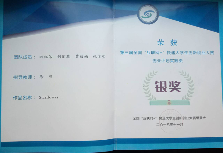 1129日,第三届全国“互联网+”快递大学生创新创业大赛全国第二轮总决赛在重庆邮电大学圆满落幕。来自全国21个单位的29支参赛队经过现场答辩、专家评审等多个环节的激烈角逐,最终决出了优胜者。我系徐燕老师指导的团队(郝钰洁、何丽花、黄丽娟、张萱萱)以作品《Starflower》荣获创业计划实施类银奖。