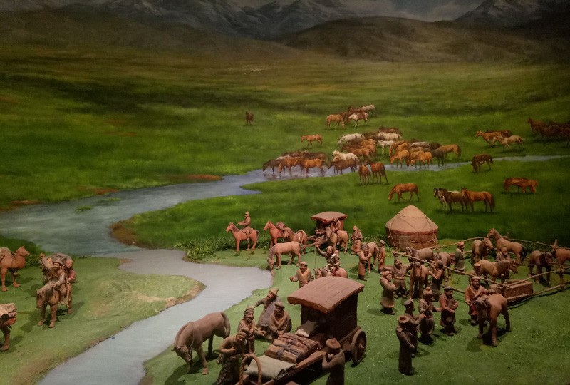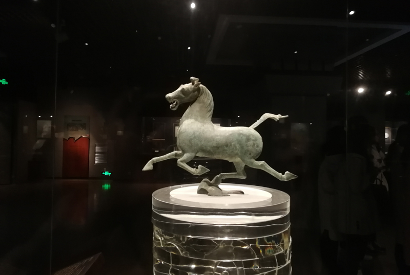 甘肃省博物馆收藏有历史文物、近现代文物、民族文物、和古生物化石及标本约35万余件。甘博内形象化的丝绸之路采用先进的科学技术集光电、动画、声等于一体。同学们启动开关,蜿蜒曲折的绵延数千里的丝绸之路就跳动了起来:阵阵驼铃、狂风肆虐、人声潮起潮落,想一想,我们的古人就往来于此间沟通着东西的文化、科技、军事。谱写着一道又一道的丝绸文明、华夏文明。 博者,广博、博深也~辉宏、举世瞩目的丝绸文明告一段落,映入眼帘的彩陶文明。