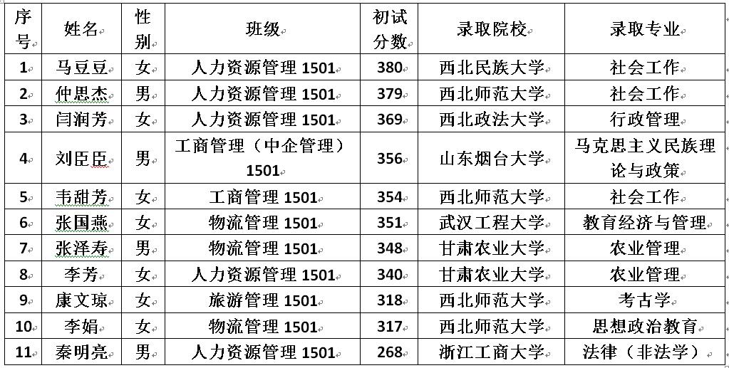 经过一年的磨砺与坚持,努力与奋斗,我系2019届毕业生中共有17位学生考研成绩达到了国家录取分数线,最终11位工管学子顺利考取硕士研究生。