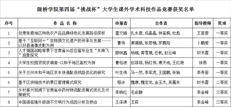 为推动我院大学生课外学术科技活动的深入发展,培养和发掘学生的创新能力和创新思维,组织做好甘肃省第十二届“挑战杯”大学生课外学术科技作品竞赛参赛作品的遴选工作,学院于20187月—12月组织开展了陇桥学院第四届“挑战杯”大学生课外学术科技作品竞赛。