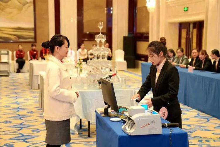本次比赛侧重于技能展示,展示内容分别为中餐厅主题摆台(升学宴、孔雀迎宾宴、生日宴),康乐部香槟塔搭建,西餐厅主题摆台。与定常摆台实操业务相比,主体摆台实操难度系数更高,但6位同学在展示过程中,都最大限度克服紧张的心态,不仅动作舒展优雅地完成摆台展示,并清晰地诠释出主题设计理念及美好寓意。前厅部4位参赛学生的展示侧重于角色扮演,展示内容为前厅接待服务礼仪规范,包括介绍房型、核实入住证件、询问付款方式、制房卡、点钞等环节,各位同学都可精湛娴熟地完成每个环节,特别是微笑礼仪贯穿对客服服务始终。