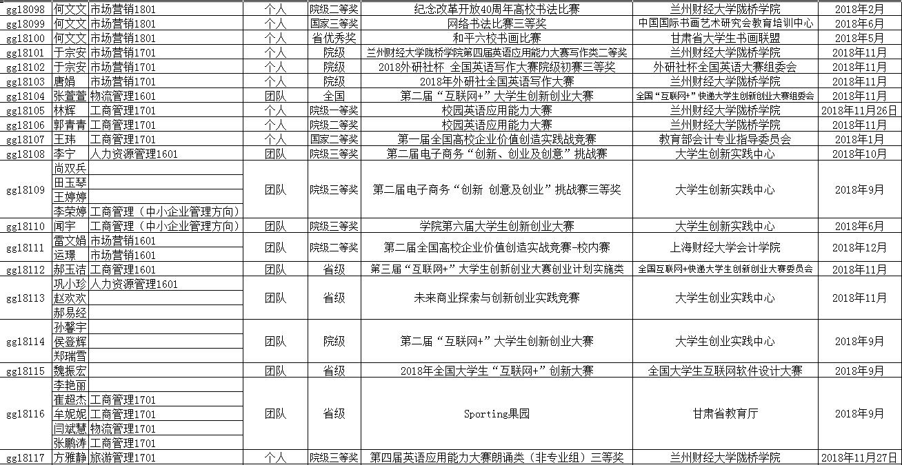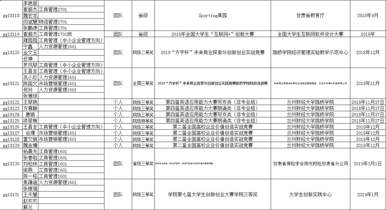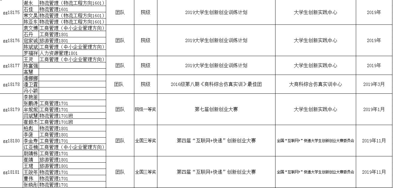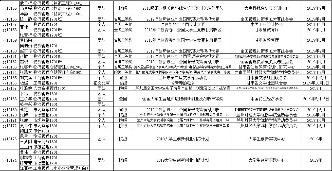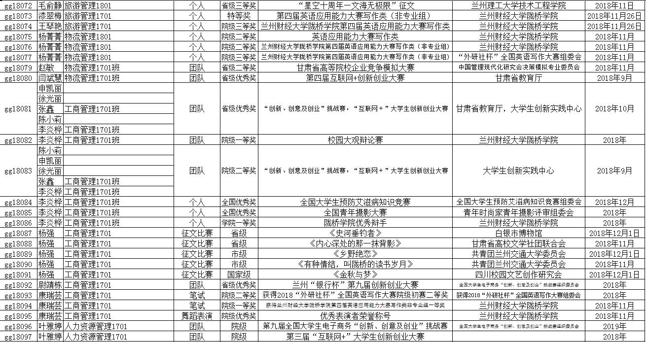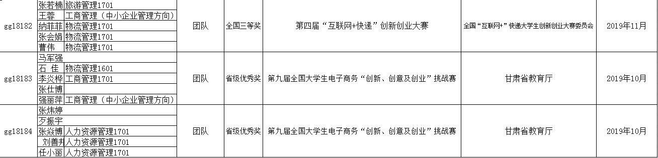 其中参加的主要比赛有:2018年“方宇杯”未来商业探索与创新创业实战竞赛、2019“学创杯”大学生创新创业综合模拟大赛、2019年“创新创业”全国管理决策模拟大赛、第十二届挑战杯甘肃省大学生课外学术科技作品竞赛、第十四届全国大学生“新道杯”沙盘模拟经营大赛、第四届“互联网+快递”创新创业大赛、第九届全国高等院校企业大赛、第九届全国大学生电子商务“创新、创意及创业”挑战赛甘肃赛区省级选拔赛、学院第七届大学生创新创业大赛、2019年大学生创新创业训练计划等。