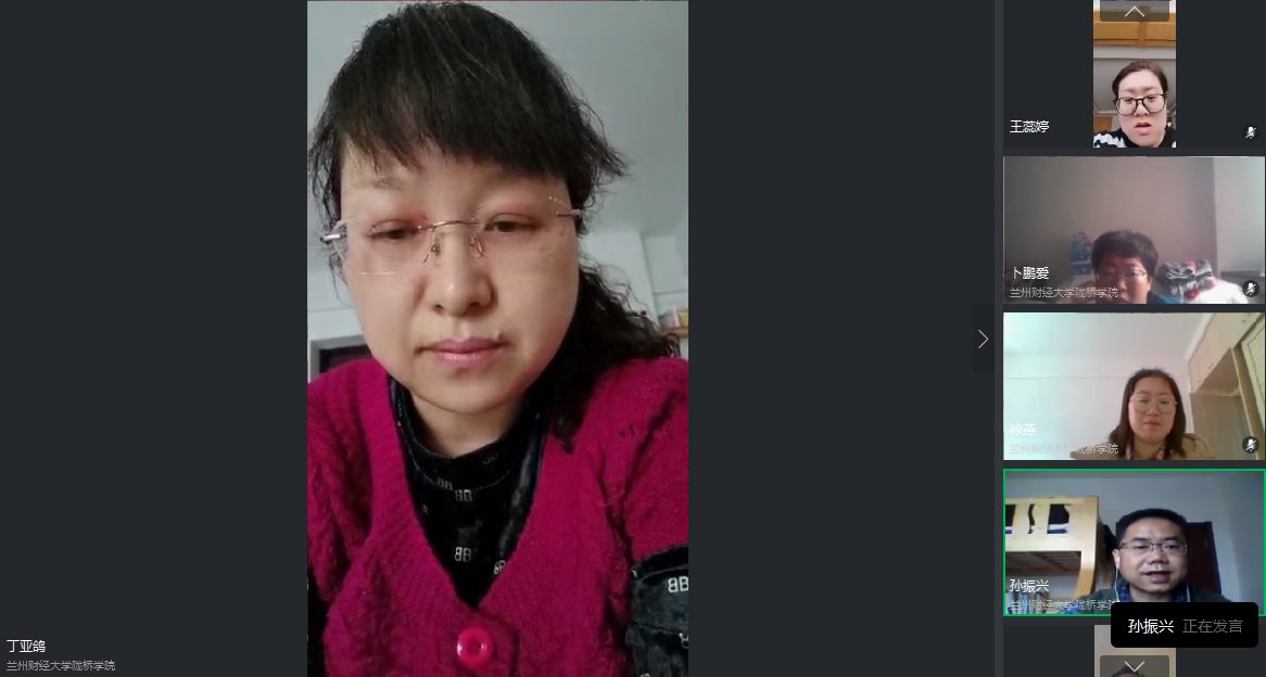 最后,丁亚鸽主任就观摩教学进行了总结:一是线上教学不同于线下,老师们要对自己要求更高、要更加严谨、要有更强的责任心;二是利用好观摩教学的学习机会,努力提高线上教学水平。丁主任还对毕业生就业工作做了以下要求:一是做好毕业论文指导工作的同时,要对毕业生的就业多给予指导和帮助;二是学生离毕业的时间不多了,抓紧时间开展有效的就业指导;三是对“慢就业”、“不就业”的学生,细心耐心的端正其就业观。