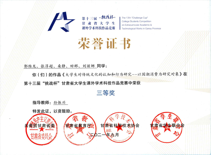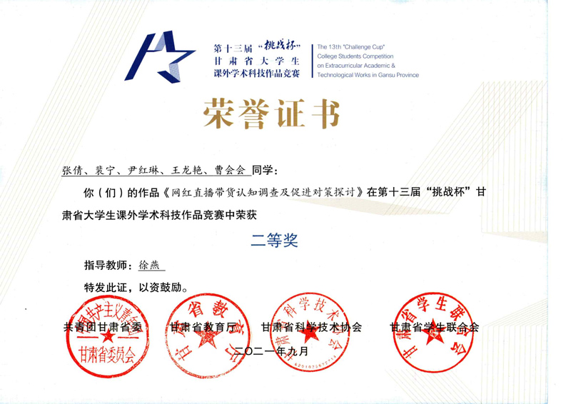 近日,我院学子在第十三届“挑战杯”甘肃省大学生课外学术科技作品竞赛中荣获优异成绩,由徐燕老师指导的作品荣获二等奖,由孙振兴老师指导的作品荣获三等奖。