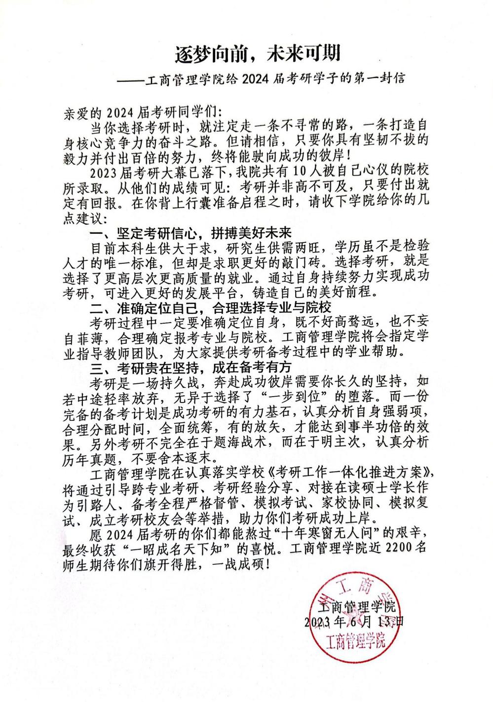 院领导和老师们为考研学生发放了学院精心准备的礼包,为考研学子送去《逐梦向前,未来可期——工商管理学院给2024届考研学子的第一封信》,暖心的礼品也让在场学子倍感温暖,倍加振奋,大家纷纷表示会更加坚定考研必胜的信心,会以更加努力学习的实际行动回报学院的关怀,迎接未来的挑战。