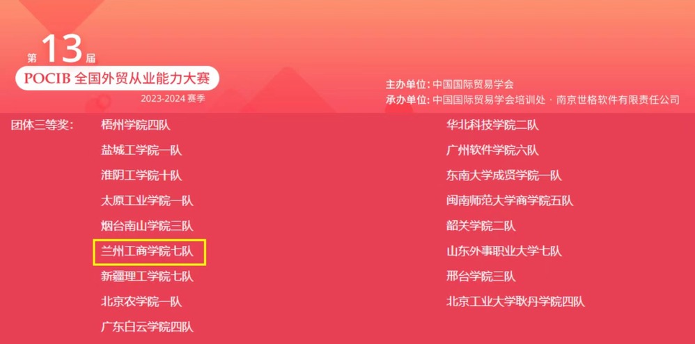 由中国国际贸易学会主办的第十三届POCIB全国外贸从业能力大赛(秋季赛)于2023年11月14日上午10时顺利结束。本届大赛共有373所院校(其中本科199个学校,高职170个学校、中职4个学校)、1056支队伍、共计10560名选手参加。我院共16名同学参加本次比赛,其中1人成绩优秀,3人成绩良好,3人成绩合格。由物流管理2101班学生组成、《国际贸易理论与实务》课程授课教师赵芳指导的兰州工商学院七队在本届大赛中斩获团体三等奖。