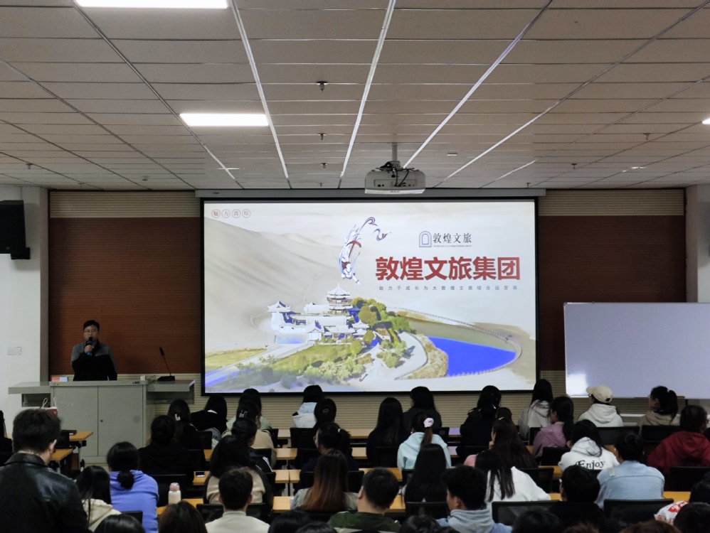动员会上马进宝介绍了敦煌文旅集团的基本情况,并对2025届实习进行了动员。敦煌文旅集团党建人事部总经理王强通过播放企业宣传视频、演示PPT、发放宣传册等方式,图文并茂介绍了企业发展近况,并就企业人才招聘需求及校企实习计划做了具体说明。