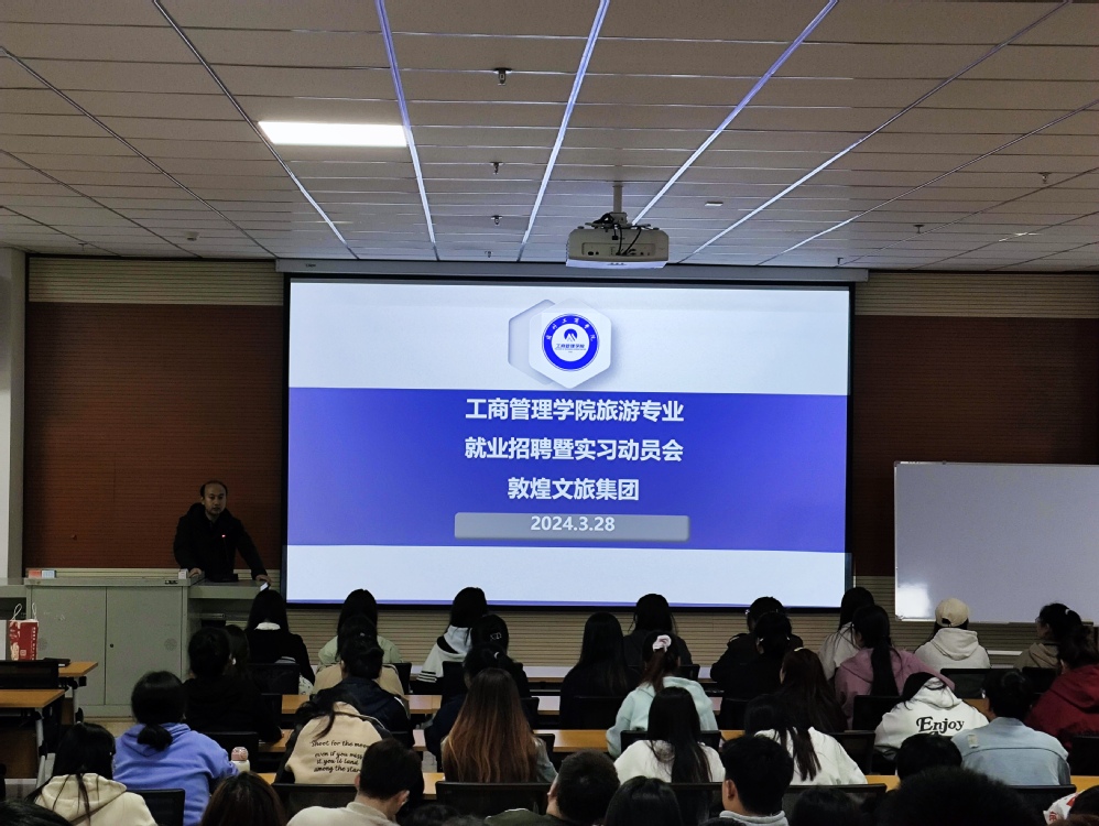 为提升学院2024届旅游管理专业毕业班学生就业工作,增强2025届旅游管理专业学生实习意愿,强化各年级旅游管理专业学生就业理念,3月28日晚,工商管理学院联合校企合作单位-敦煌文旅集团组织召开旅游管理专业学生就业招聘暨实习动员会。会议在综合教学楼C503教室召开。敦煌文旅集团党建人事部总经理王强、学院党委书记兼行政院长马进宝、教学院长徐燕及旅游管理专业学生共160余人参加了动员会,会议由马进宝主持。