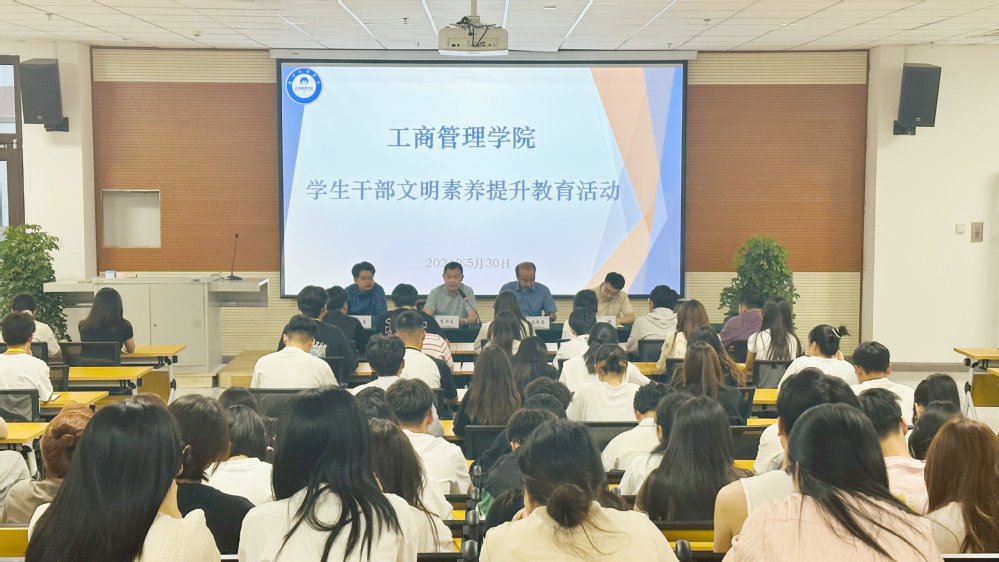 为落实《关于开展“树文明风尚,展青春风采”学生文明行为素养提升教育月的通知》文件精神,引导我院学生树立正确的交往观念和着装意识,培养学生良好的行为习惯,构建积极向上、文明和谐的校园文化。5月30日晚自习期间,工商管理学院组织校园文明督导队、各班班委召开全院学生干部文明素养提升教育大会,会议在综合教学楼C503教室举行,学院党委书记兼行政院长马进宝、行政院长助理张鹏、团总支书记陈岩出席会议,会议由办公室主任李兴龙主持。