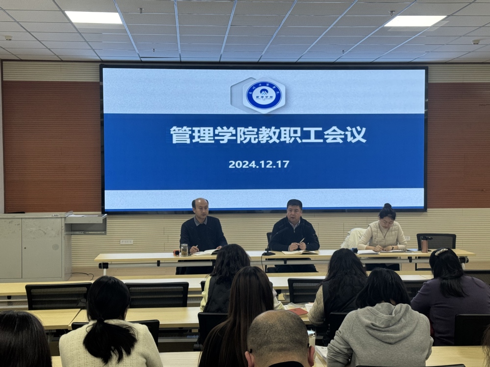 12月17日下午,管理学院在C501成功召开了全体教职工会议。本次会议旨在总结过去一年的工作成果,分析当前面临的新形势与新挑战,并规划未来的发展计划。学院领导班子成员、全院教职工参加了会议,会议由学院党委书记兼行政院长马进宝主持。