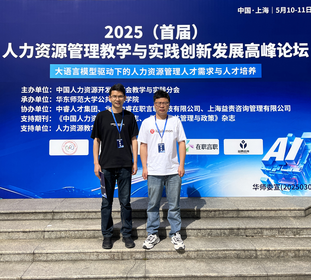 为深入推动产教融合,探索人工智能时代下人才资源管理中教学和实践的创新模式,2025年5月9日-11日,管理学院教师王纪伟、李德成老师前往华东师范大学,参加2025(首届)人力资源管理教学与实践创新发展高峰论坛。