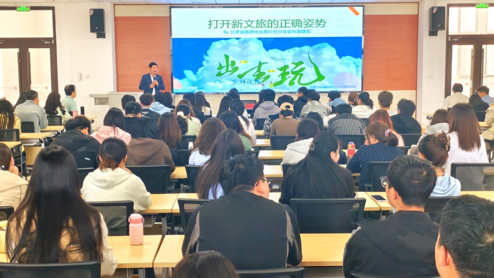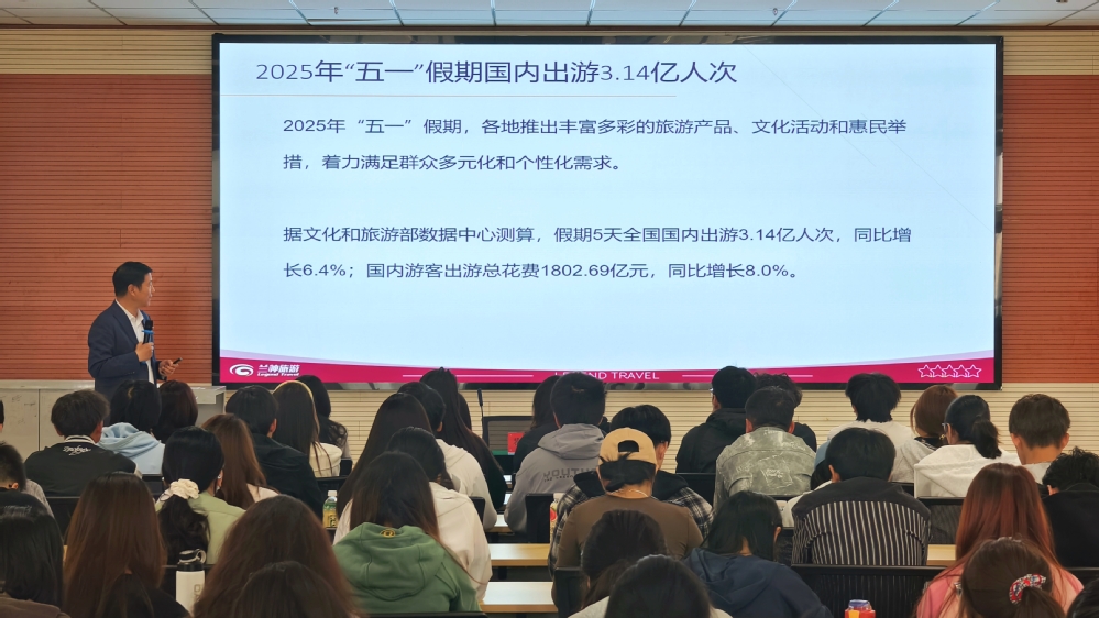 讲座中,裴建宏总经理立足全球旅游业发展动态,结合兰神国际旅行社的实战经验,深度剖析了后疫情时代旅游行业的转型方向。他指出,“新旅游”的核心在于“体验重构与技术赋能”,并从需求升级、技术驱动和责任旅游三大维度展开分享。裴建宏通过大量真实案例,揭示了旅行社运营中的风险管理、客户服务创新及跨界资源整合策略。他特别提到兰神旅行社与高校合作的“行者听计划”,鼓励学生通过项目实战积累经验:“旅游业的未来属于敢于打破边界的人,从元宇宙文旅到银发康养游,处处都是新赛道。”