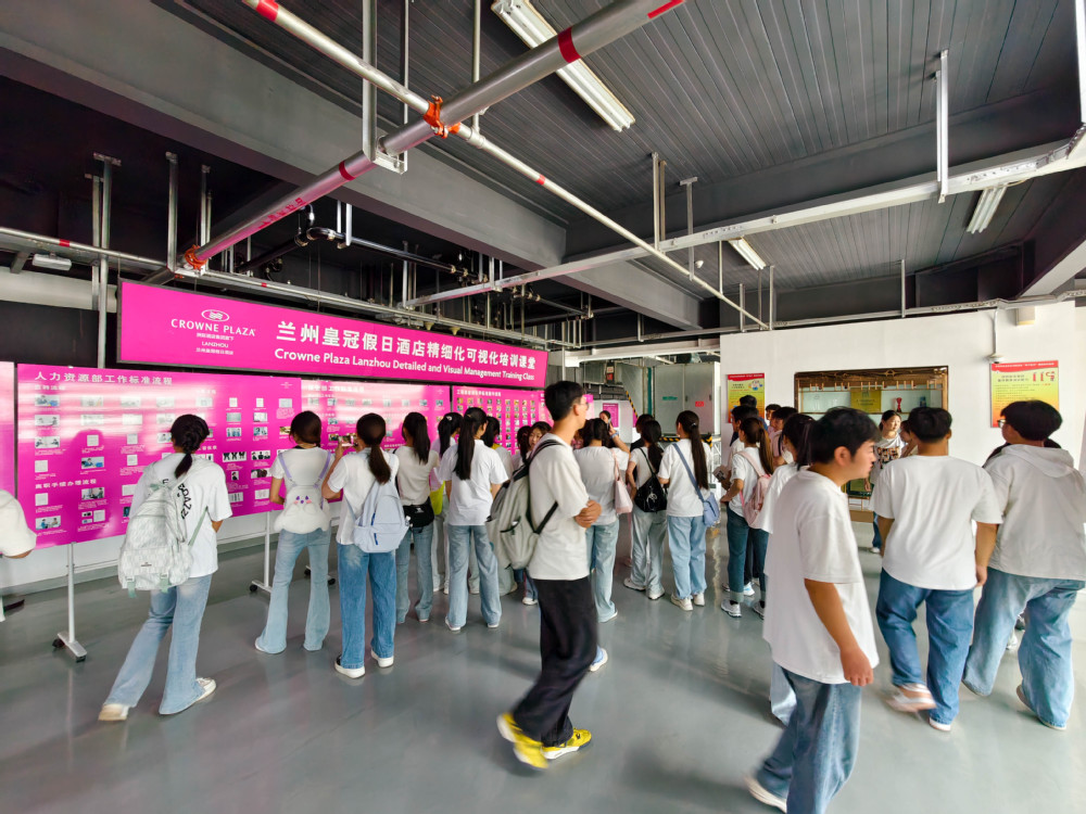 在酒店业主代表张伟及相关部门负责人的陪同下,师生一行先后参观了甘肃大剧院、33楼星光厅、敦煌厅、29楼行政酒廊等多个区域,深入了解酒店的环境设施、企业文化、365天可视化工作法、标准流程可视化工作法等内容。从河景高空露台到标准化库房管理,学生们直观感受到酒店从前端服务到后台保障的全流程运营模式,对 “双绿” 酒店、节能降耗、资产精细化管理等理念有了具象认知。