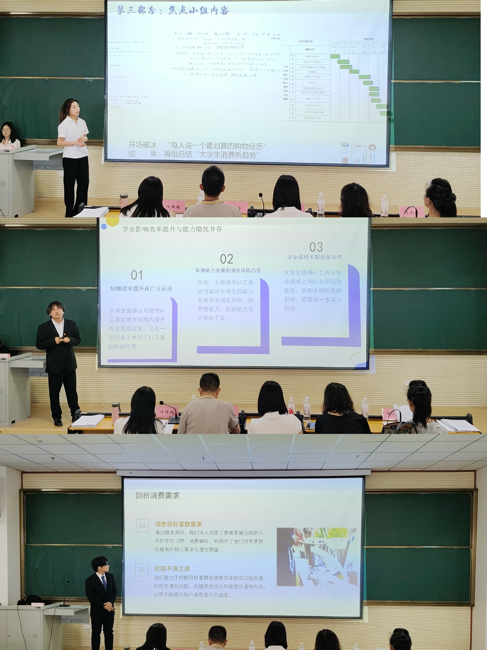 比赛采用“10分钟陈述+5分钟答辩”的竞赛模式,全面检验参赛团队的市场洞察能力与数据分析水平。由甘肃农业大学张自尧副教授、兰州文理学院王晓涵教授、甘肃中医药大学颜鲁合副教授、兰州财经大学任祥铭老师及行业导师杨天骄女士等专家组成的评审团,依据科学性、创新性、实用性等核心维度进行综合评判。各团队通过详实的数据图表、严谨的分析模型,展示了扎实的专业功底。最终,《Z世代消费主义祛魅与理性回归:基于兰工商大学生的市场调查》、《大学生使用 AI工具完成作业与学业依赖性调研报告》、《指尖上的消费密码:大学生网购行为模式与决策机制研究》团队以其优异的表现获得本次大赛市场调查赛道的前三名。