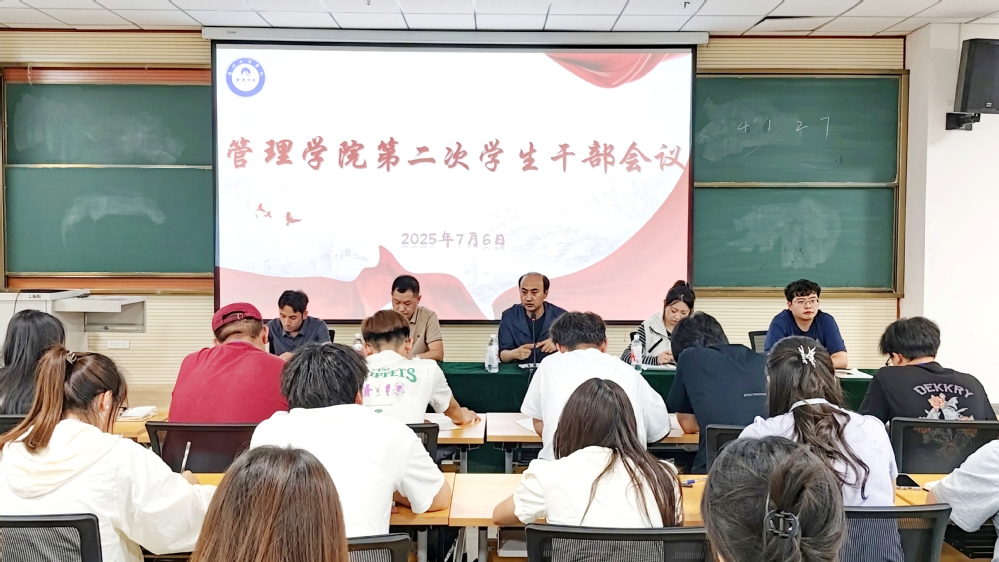 2025年7月6日,管理学院在C503召开了全院学生干部会议,旨在回顾过去的工作成果,深刻剖析存在的问题,并明确未来的工作方向与目标。出席本次会议的有管理学院党委书记、行政院长马进宝、党委副书记王佳宁、办公室主任李兴龙、团总支书记陈岩、陈晓鹏、各班班委以及团学干部代表。