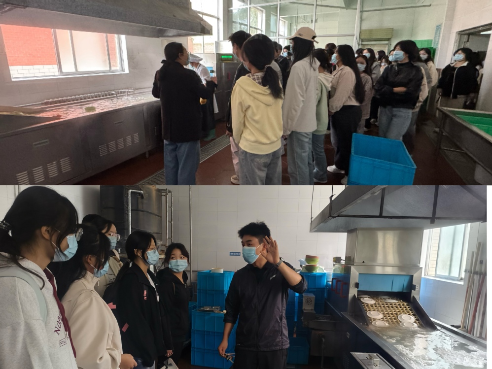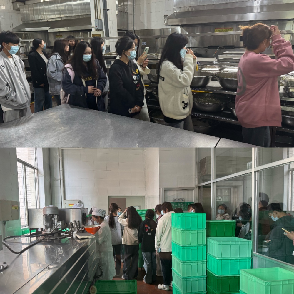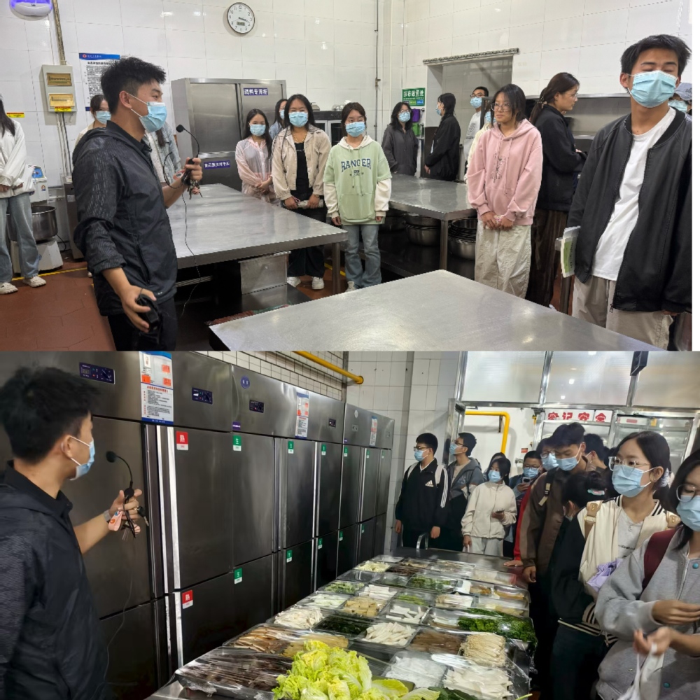 在清洗加工区,餐具消毒间内,高温消毒柜、消毒灯等设备有序运转,消毒后的餐具统一存放在密闭保洁柜中,整个流程规范透明;在食材仓储区,各类食材分类存放、标识清晰,米、面、油等干货离地离墙摆放, “所有食材都必须‘三证齐全’,并且要现场检验合格后才能入库,坚决杜绝‘三无’产品。” 管理人员的讲解让同学们对食材源头安全有了清晰认识;在烹饪区、备餐区,灶台洁净无油污,操作台面干净整洁、各类备餐分类有序、冷藏冷冻食品严格区分且温度实时监控。工作人员详细介绍了学校食堂在食品安全管理方面的制度体系,包括食材采购 “索证索票” 制度、每日晨检与消杀制度、食品留样制度等核心举措。并强调 “校园安全无小事,食品安全是底线”,学校始终将师生饮食健康与用餐安全放在后勤工作的首位,欢迎同学们全程监督、多提建议。