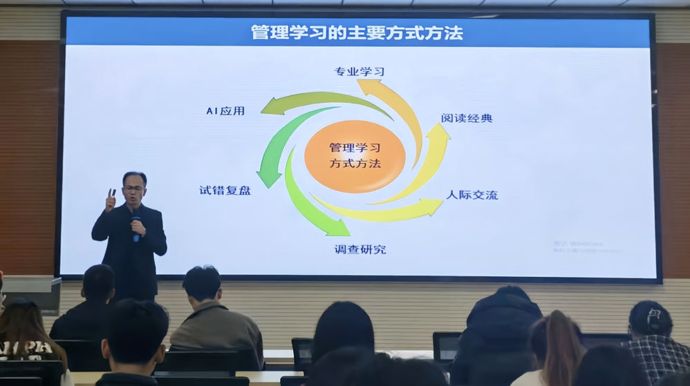 董教授进一步从“自我定位与方向的再认知”“学习与管理的本质”“人工智能时代的变与不变”以及“AI对管理学习者的赋能路径”四个方面,引导学生反思当前学习路径,并提出适应未来趋势的学习策略与方法。他强调,学生应主动拥抱AI技术,善用人工智能工具辅助学习与实践,同时注重试错复盘、开展实地调研、加强人际交流、坚持阅读经典、深化专业学习,全面提升综合素养与创新能力。