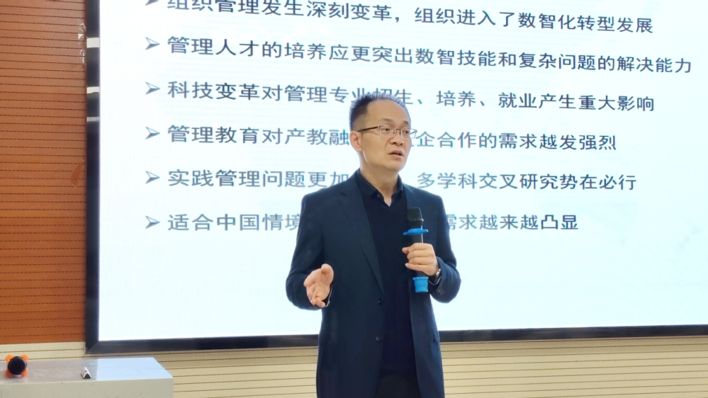 讲座伊始,董教授从人工智能时代的发展背景切入,围绕“数智赋能、问题导向、学科交叉、产教融合”四大核心维度,系统阐述了AI时代管理教育所面临的新形势,深入剖析了管理类专业学生在学习中遇到的挑战与现实困境。他指出,当前人工智能技术已深度融入企业战略规划、运营管理、人力资源等各类管理实践,推动组织管理模式发生深刻变革。在这一背景下,数智化转型已成为企业生存与发展的必然选择。