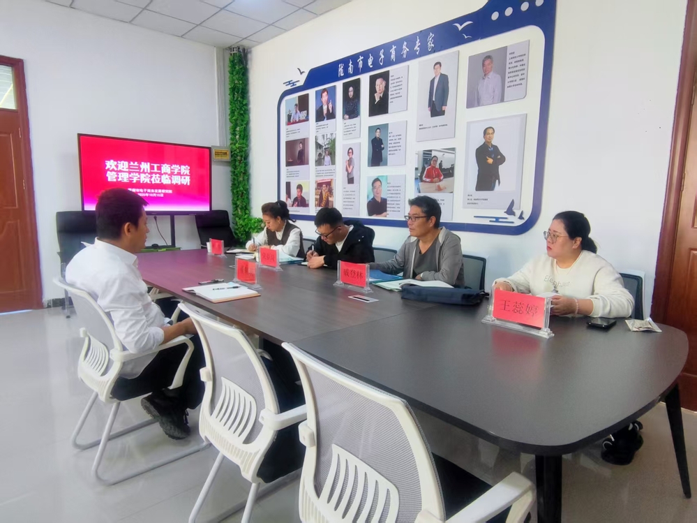 10月15日,调研团队首站走进陇南市电子商务发展研究院。研究院秘书长董朝羽热情接待并主持座谈。他系统展示了研究院在电商孵化、品牌赋能和县域数字商贸网络建设方面的最新成果,戚登林副教授介绍了学院办学定位、调研初衷及创业管理微专业的建设方案。双方围绕课程共建、师资互聘、学生认知实习等话题深入交流,初步达成产教融合战略合作意向。