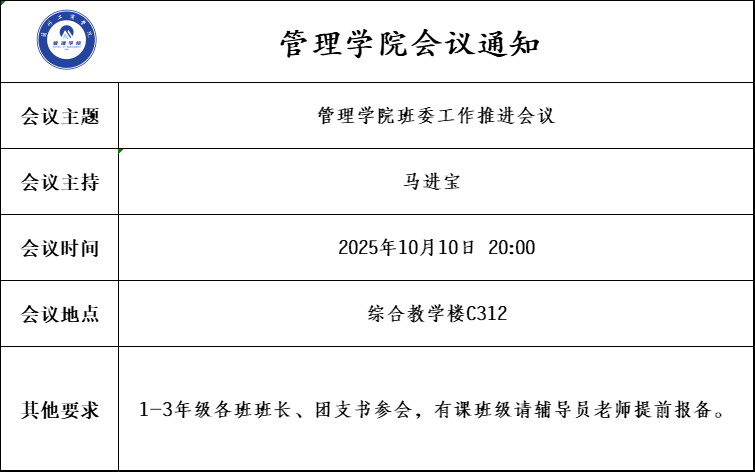 2025年10月10日晚八点,管理学院班委工作推进会议在综合教学楼C312召开,管理学院召开班风学风建设研讨会,旨在加强班级建设,营造积极向上、团结奋进的班风学风,出席会议的有学院书记,各班级班长、班干部代表等。
