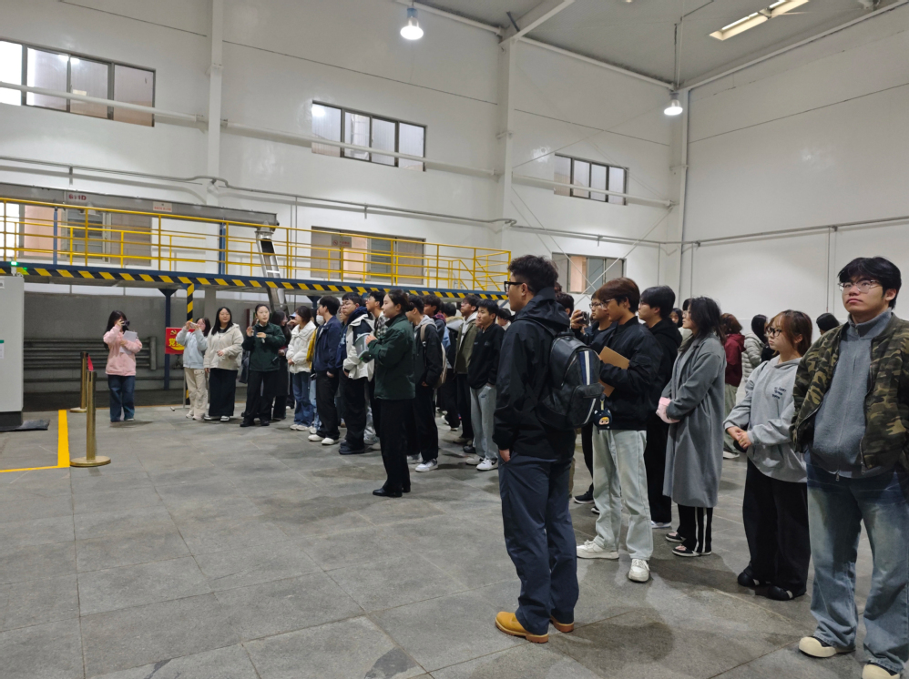 在讲解员的带领下,同学们依次参观了制曲车间、酿酒车间、明代酒海养酒馆、万吨陶坛库及现代化包装线,全程近距离感受“浓香西北第一窖”400余年的古法酿造技艺。讲解员把“酿造生态酒,传递正能量”的企业使命与“绿水青山就是金山银山”的生态理念融入讲解,引导学生在品味酒文化的同时,理解绿色发展、质量强国、品牌强国等国家战略背后的产业逻辑,进而将专业认知升华为价值认同。