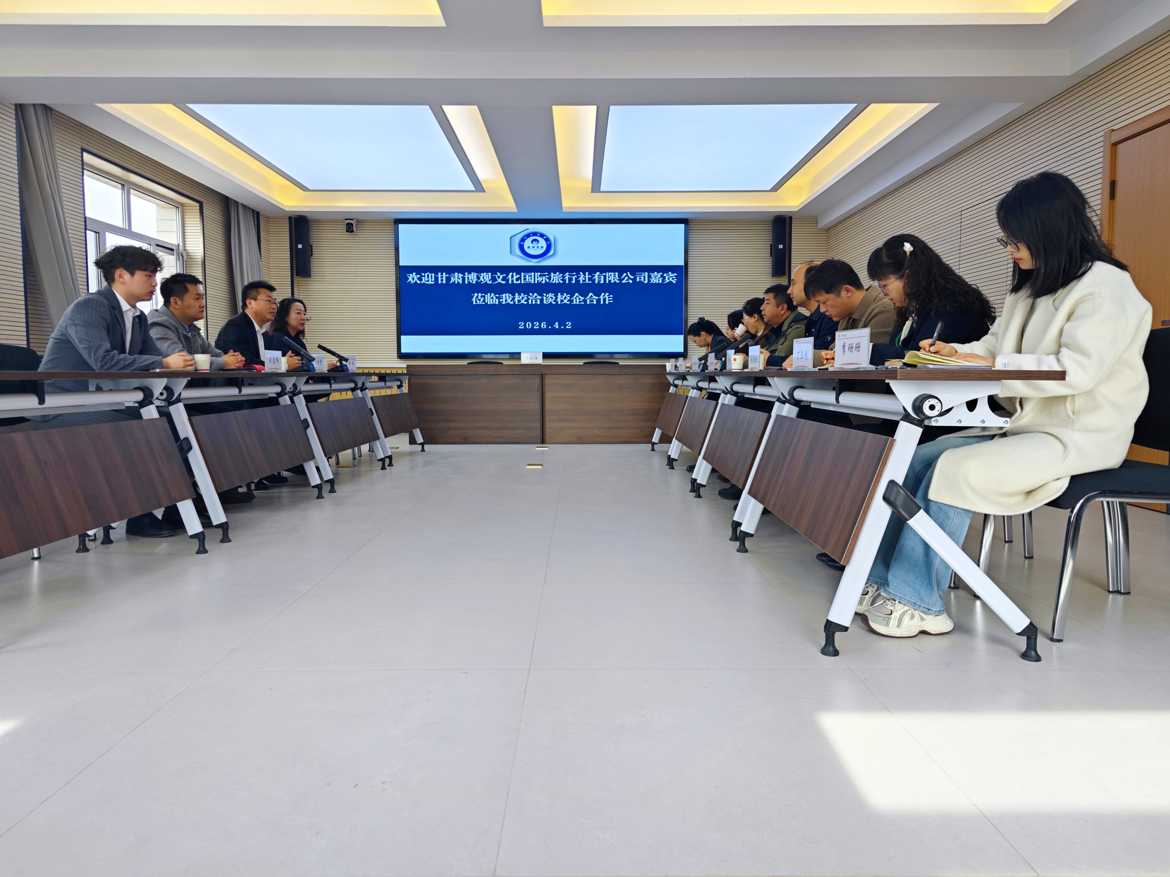 为进一步深化校企合作、推进产教融合、创新人才培养模式,为学生搭建优质实习就业平台,2026年4月2日,甘肃博观文化国际旅行社有限公司总经理李兴贵、副总经理白璐、研学中心总监王志伟一行莅临兰州工商学院开展校企合作交流座谈。管理学院院长把多勋、党委书记马进宝、教学院长徐燕及教师代表参加会议。