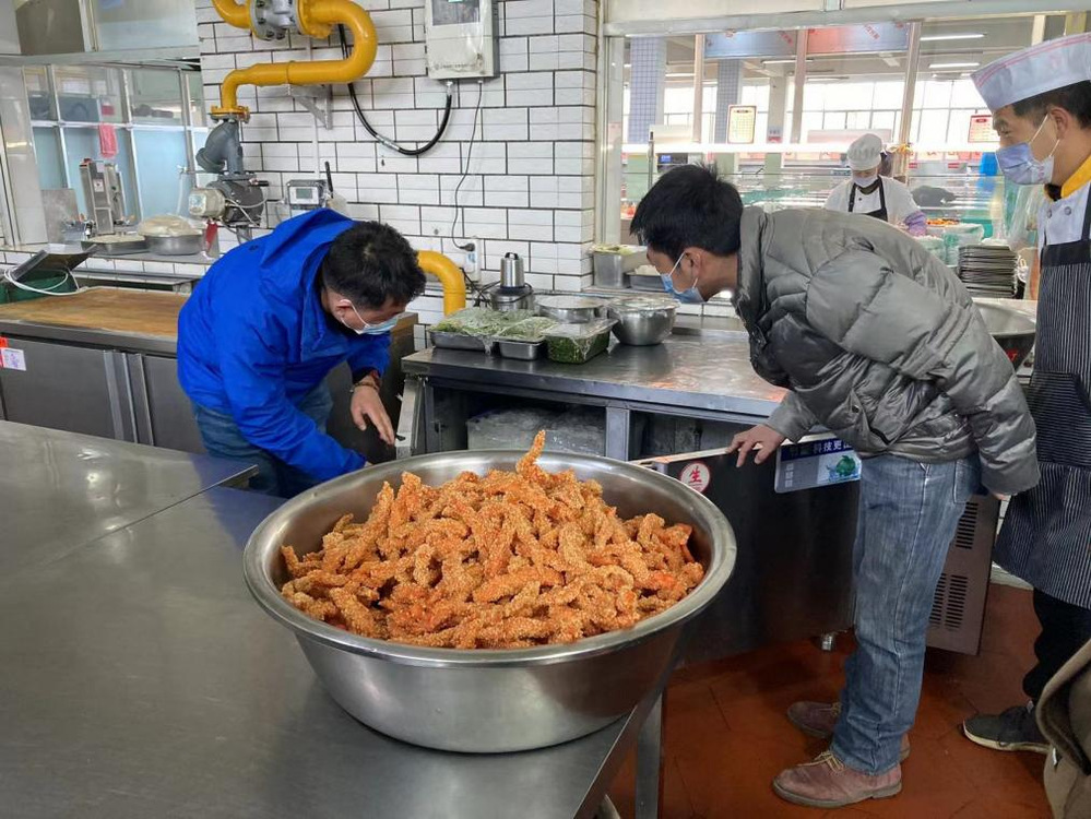1113日上午,副校长茹作佳带领后勤管理处处领导班子及膳食科管理人员对学校食堂进行了全面细致的检查。此次检查以省市场监管局的监督检查要求为标准,对餐饮服务活动中食品采购、贮存、加工、供应、配送和餐()具、食品容器及工具的清洗、消毒等环节做了详尽的检查。同时对各食堂食品加工操作基本流程、食品留样、库房内货物的标识标签、各类原材料的索证索票进行了逐一查看。