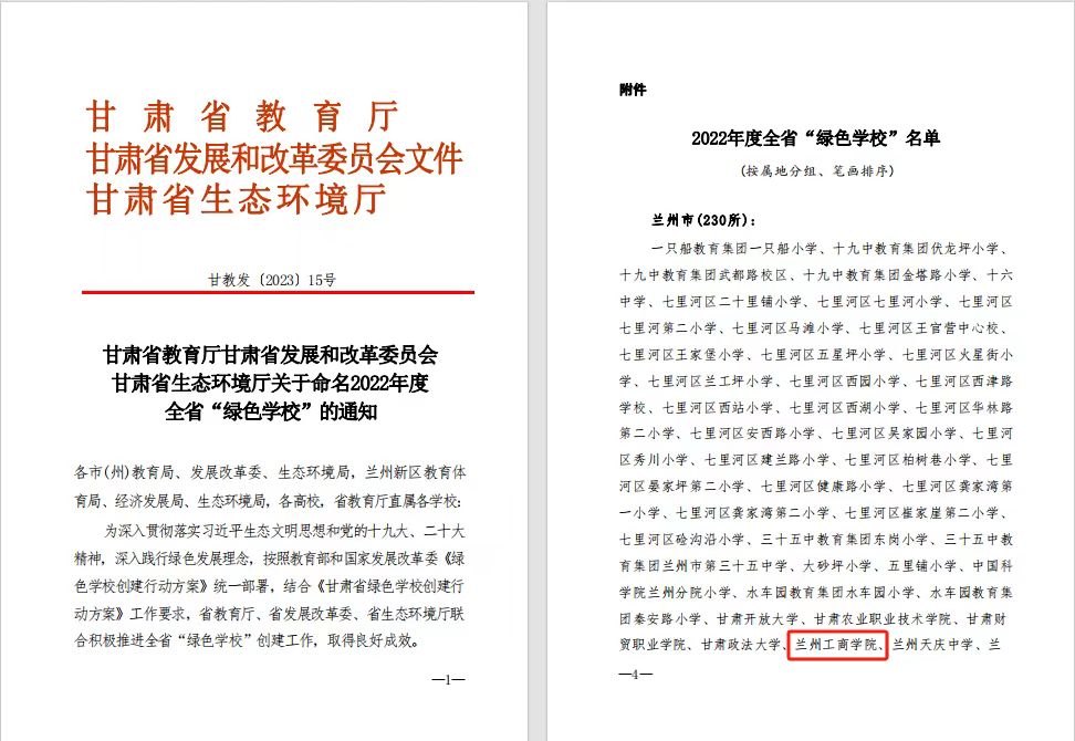 近日,甘肃省教育厅、甘肃省发展和改革委员会和甘肃省生态环境厅联合印发《甘肃省教育厅、甘肃省发展和改革委员会和甘肃省生态环境厅关于命名2022年度全省“绿色学校”的通知》(甘教发〔2023〕15号),兰州工商学院名列其中,荣获甘肃省“绿色学校”称号。