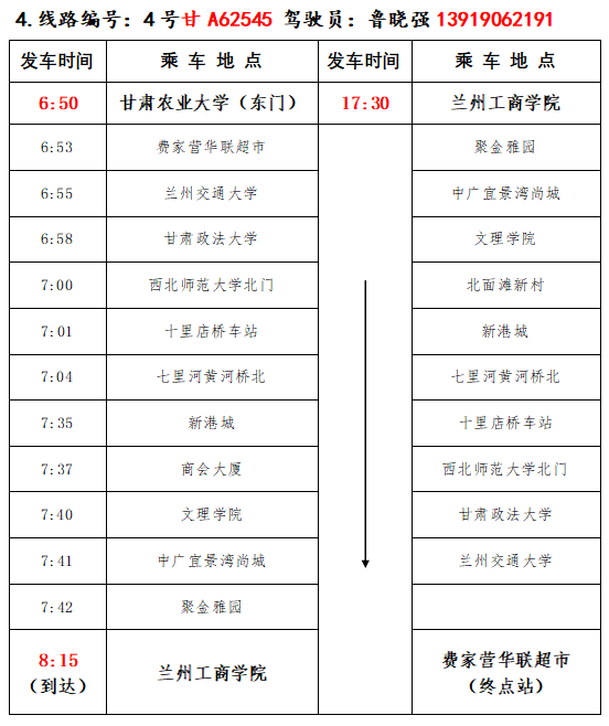 根据兰州市住房和城乡建设局公告(关于兰州市城关区北环路罗锅沟大桥车辆限高、限载的公告),将于2024年11月6日至2025年11月5日,昼夜24小时对北环路罗锅沟大桥进行维修养护,车辆禁止通行.故对4号通勤车(兰工商-安宁)线路进行调整,请各位教职员工仔细查看通勤线路、停靠点及发车时间,以免发生漏乘、误乘。具体线路安排如下: