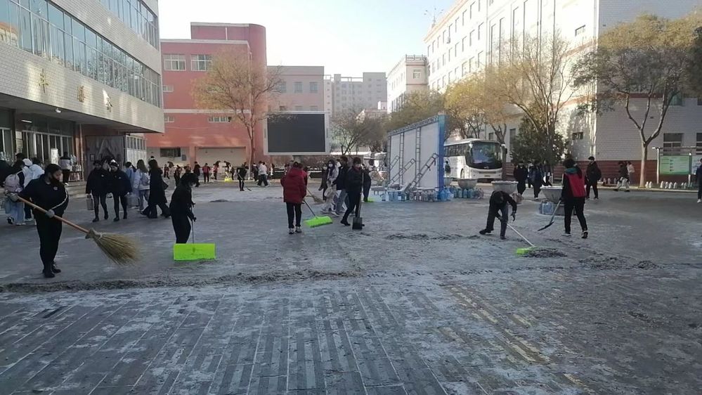 后勤管理处环卫绿化科组织绿化工、清洁工50余名职工开展积雪除冰作业,重点对大草坪区域的道路、踏步台阶处、食堂门口、学生公寓门口等区域进行了抛洒工业盐及清理工作。