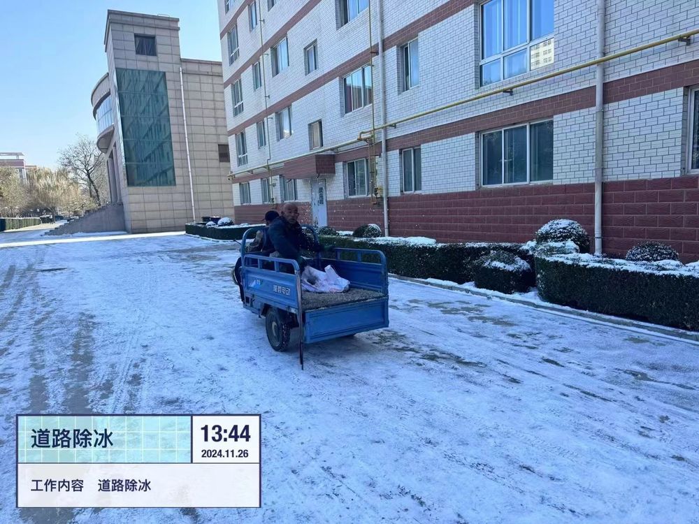 近日来,我校地区迎来低温雨雪冰冻天气,为保障师生出行安全,确保道路通畅,避免因低温天气带来的安全隐患,后勤管理处第一时间开展除雪作业,多措并举、凝心聚力,全面做好后勤保障工作。