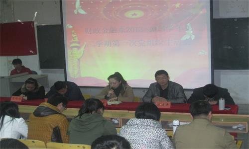 2014年3月14日财政金融系全体党员在善问楼215教室召开了本学期第一次党组织生活会。大会主要就上学期党建工作情况做出了总结并对本学期党内的工作做了部署。财政金融系党总支副书记郭思莹,各学生党支部书记及全体学生党员参加了会议,会议由党政秘书陈建平主持。